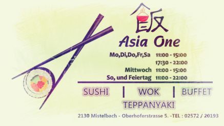 10 % Erm.! Genussvolles Speisen in einem schönen Restaurant. Sushi - Wok - Buffet - Teppanyaki. Kommen Sie vorbei u. fangen Sie an zu genießen. ÖZ: Mo, Di, Do, Fr, Sa von 11.00-15.00 Uhr u. 17.30-22.00 Uhr; Mi von 11.00-15.00 Uhr, So u. Ftg. von 11.00-22.00 Uhr.