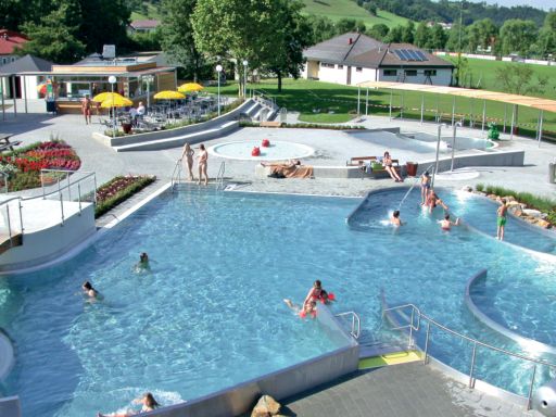Beheiztes Wellness- u. Erlebnisfreibad, Babybecken, 47 m Wasserrutsche, Sprungturm, Strömungskanal, Whirl-Liegen, überdachter Kindersandplatz, Bodentrampolin, Beach-Volleyballplatz, Badbuffet u. eine große Liegewiese. Im Juli u. Aug.: jeden Do Nachtbaden bis 22.00 Uhr.
