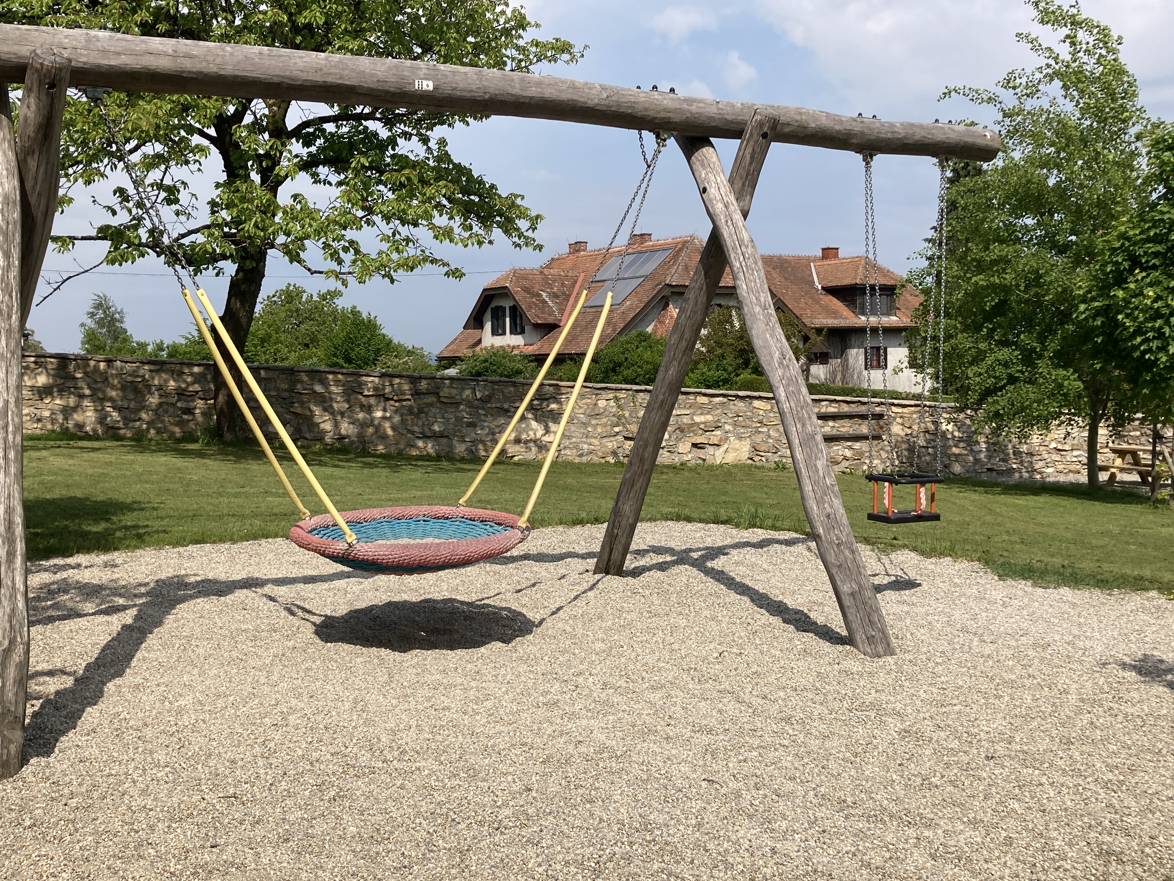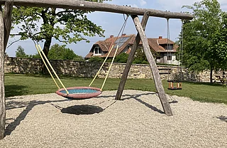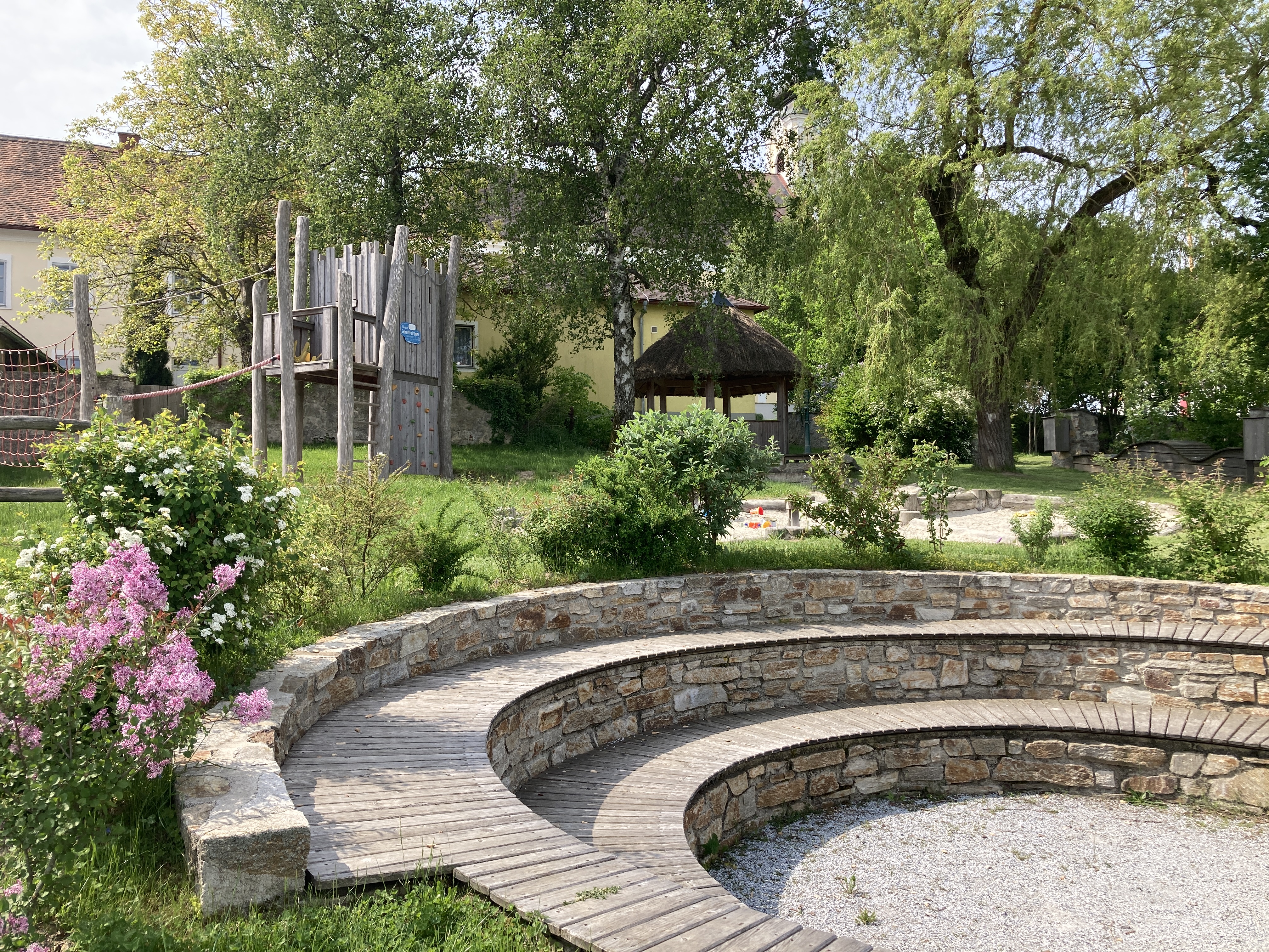 Kinder können sich an Spielgeräten aller Art austoben, Erwachsene können Platz nehmen und die herrliche Aussicht genießen und für Jugendliche gibt es Treffpunkte und naturnahe Bereiche zum Chillen und Zusammensetzen. Auch die Schulkinder kommen für die eine oder andere Unterrichtsstunde vorbei. Vor allem der Bereich „Klettern“ erfordert einiges an Geschick: im Seiledschungel mit hohem Stelzenhaus oder in der Geodätischen Kuppel sind verschiedene Schwierigkeitsgrade vorgegeben, klettern lernen und üben ist erwünscht. Besonders gelungen ist die große mehrstufige Sitzarena aus Naturstein und die Sitzmöglichkeiten aus Holz an der alten Steinmauer.