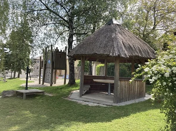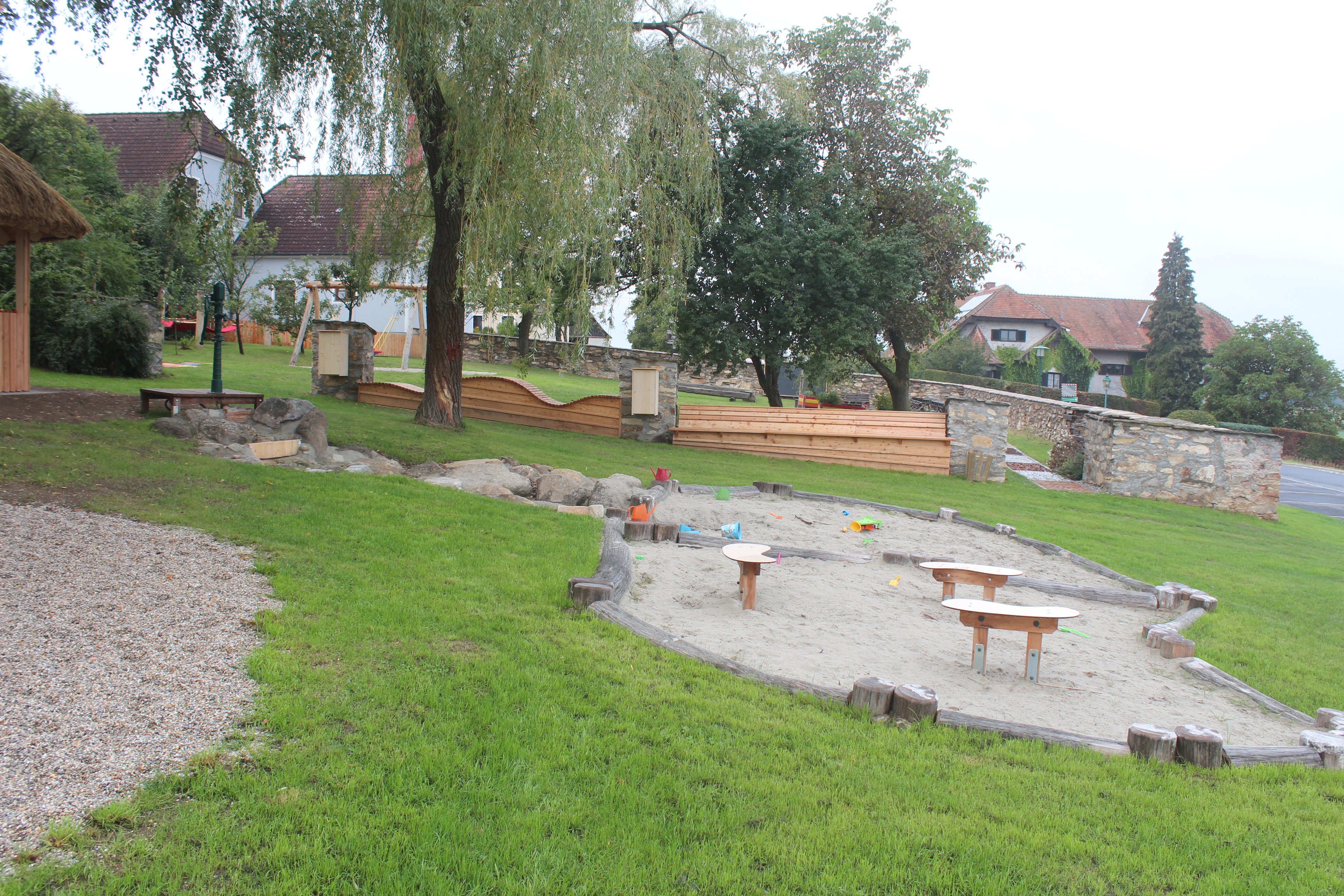 - Sand-Wasserspielbereich mit Wasserlauf und Trinkbrunnen