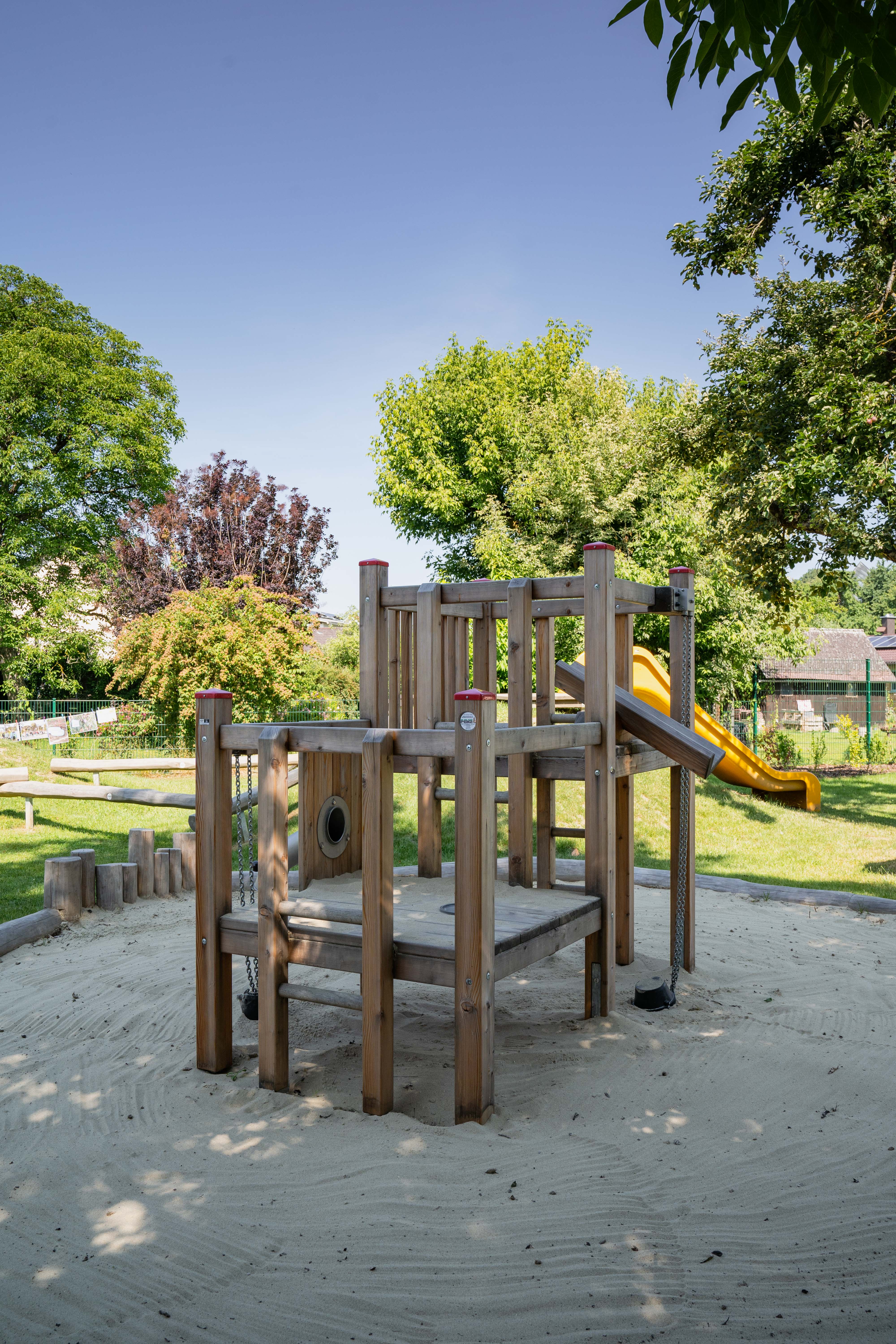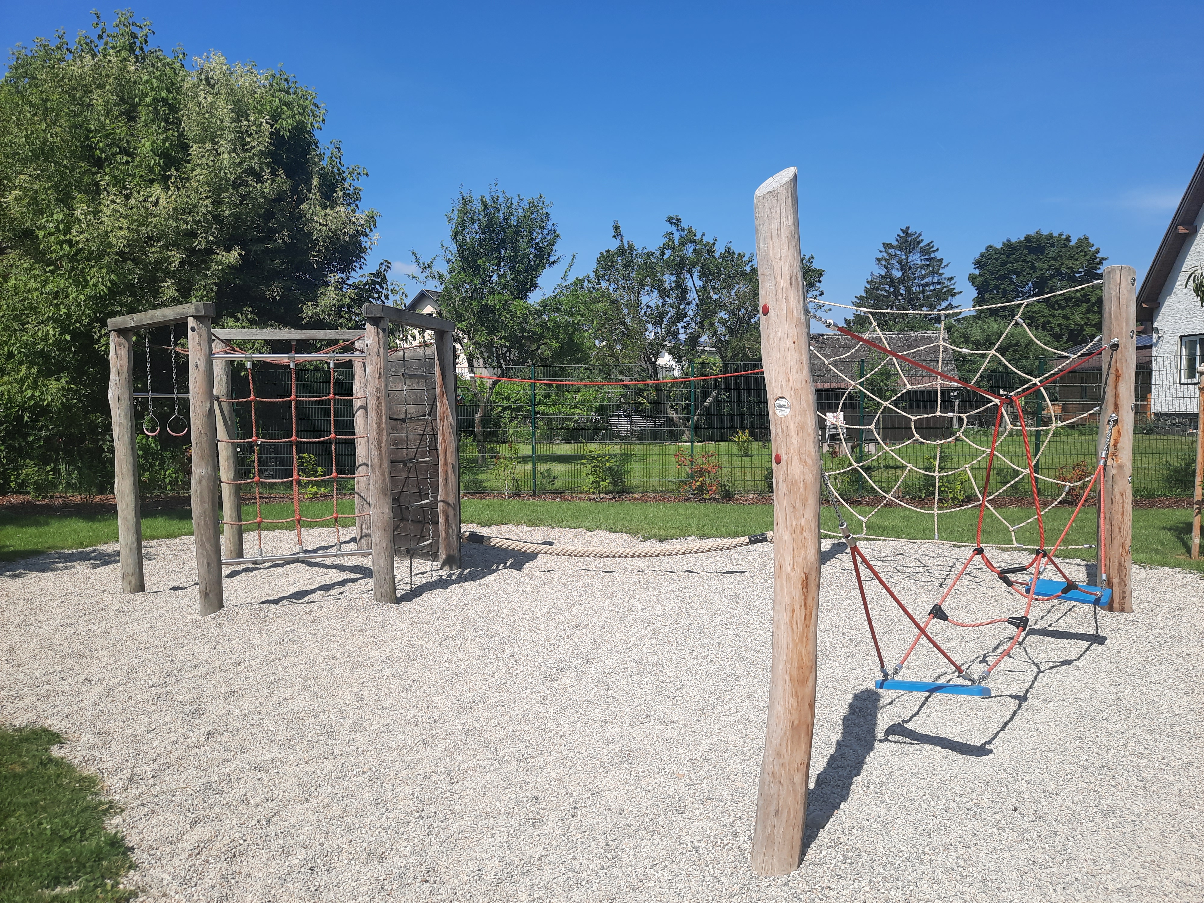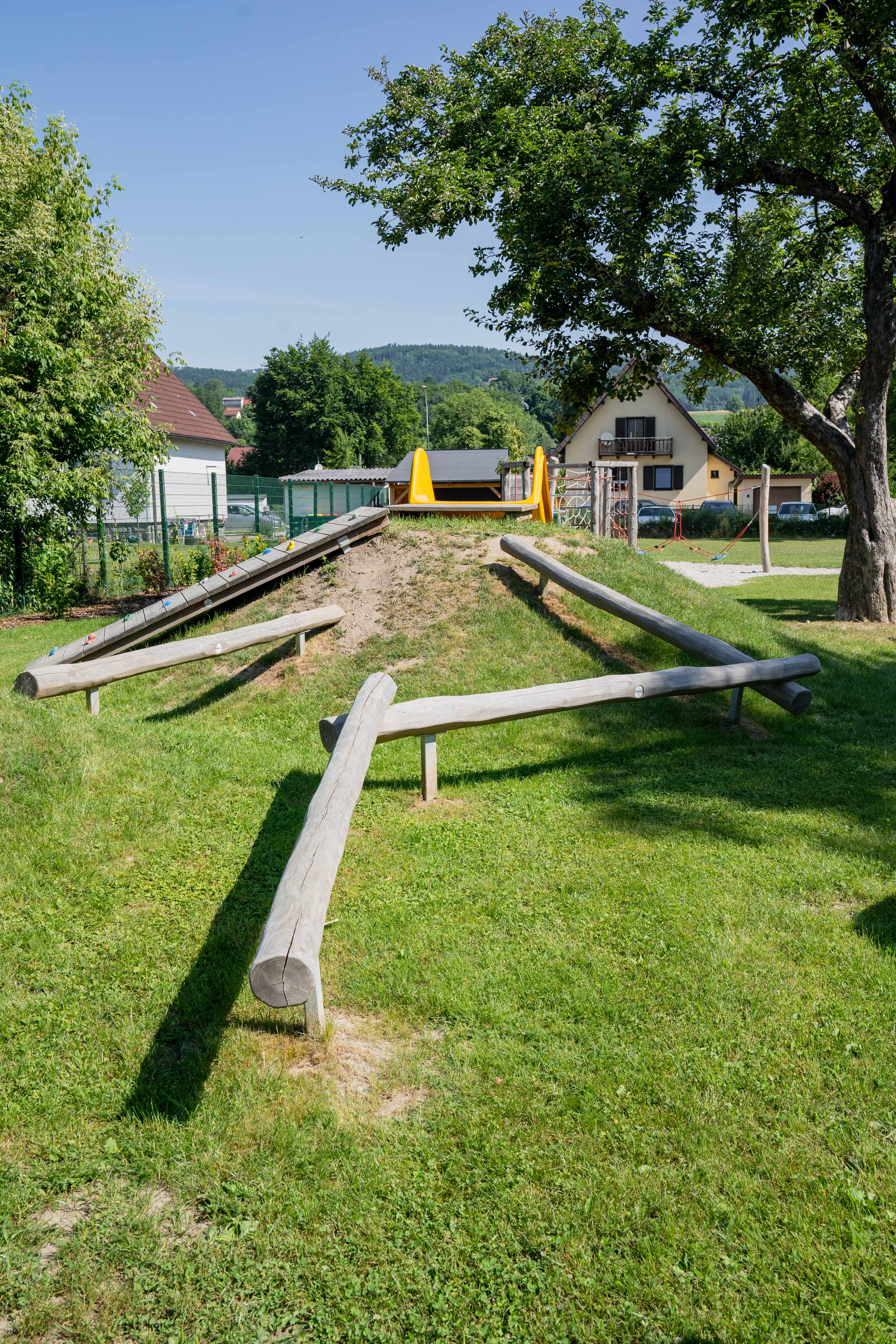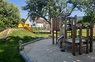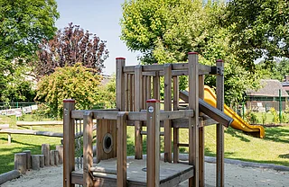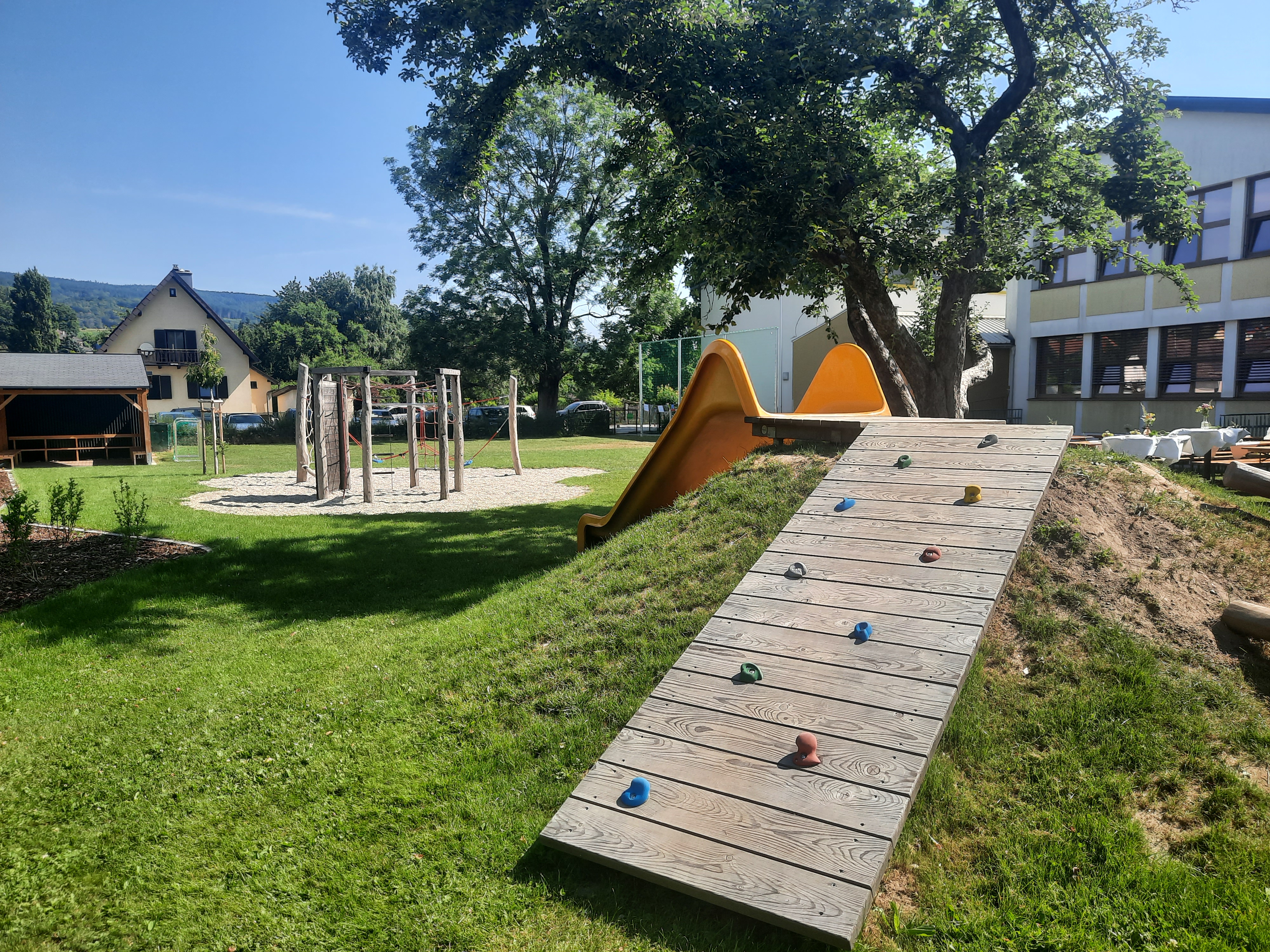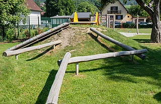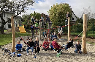 Der Freiraum eignet sich zudem hervorragend für Unterrichtseinheiten im Freien und bietet den Kindern in der Nachmittagsbetreuung einen angenehmen Ort für erholsame Spiel- und Plauderpausen. Zudem wurde in der Planung inklusives, barrierearmes Spiel in den Fukus gerückt: an einem der beiden Hügel wurde eine breite Rutsche mit Rampe angebracht und die Nestschaukel wurde bewusst so positioniert, dass sie auch mit einem Rollstuhl erreichbar wäre.