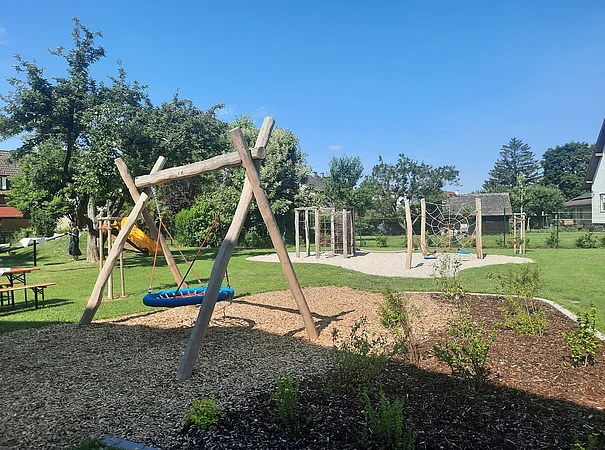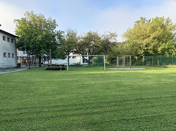Der Schulgarten der Volksschule bietet eine Vielzahl an Bewegungs- und Spielmöglichkeiten und lädt die Kinder dazu ein, ihren Schulalltag aktiv, kreativ und zugleich entspannt zu erleben. Eine gemütliche Hütte ermöglicht einen geschützten Rückzugsort zum Plaudern, Lesen oder Ausruhen und im Bereich vor der Schule befindet sich außerdem ein überdachtes „Grünes Klassenzimmer“ – eine große Tisch-/Bankkombination mit Pergola - die für Unterricht im Freien zur Verfügung steht.