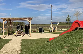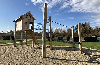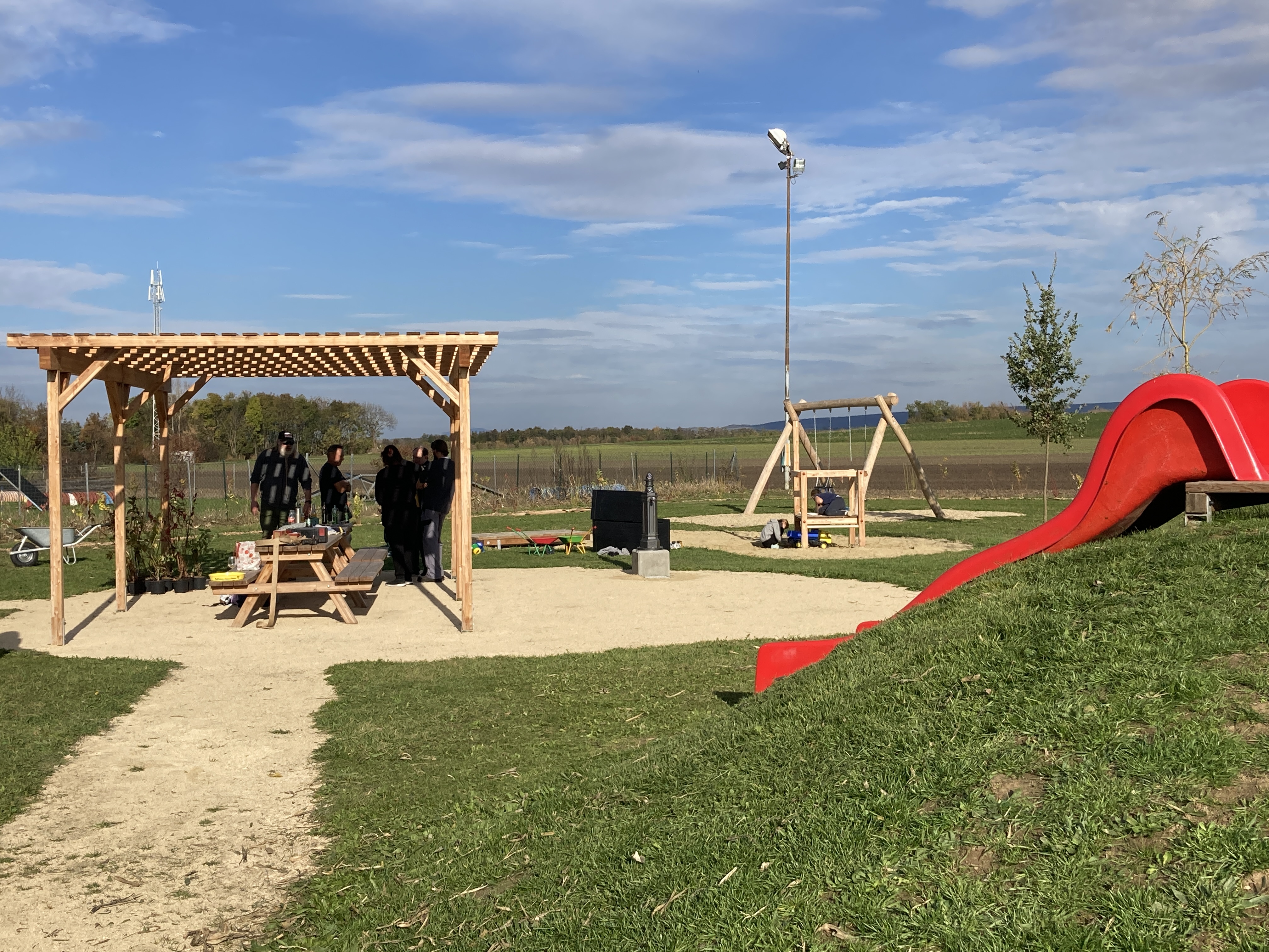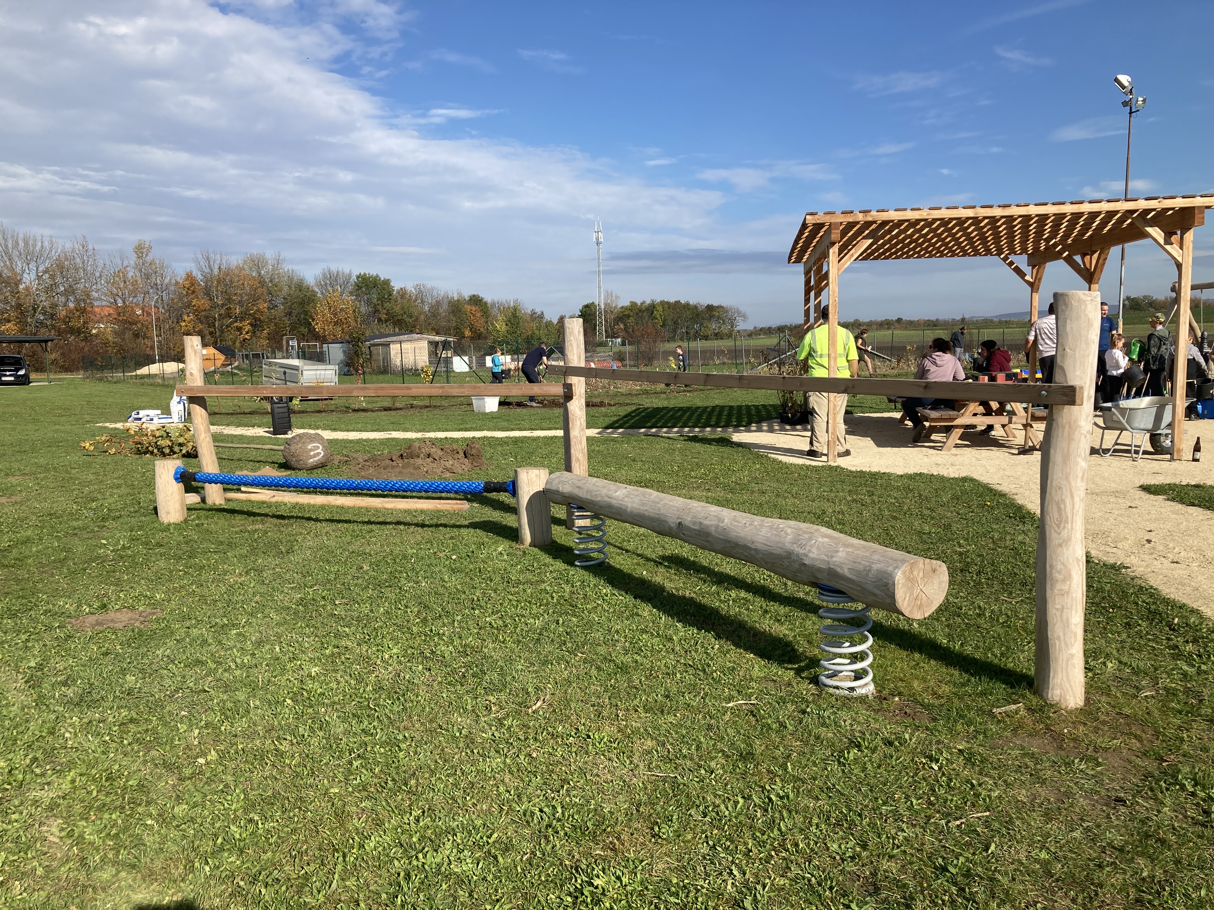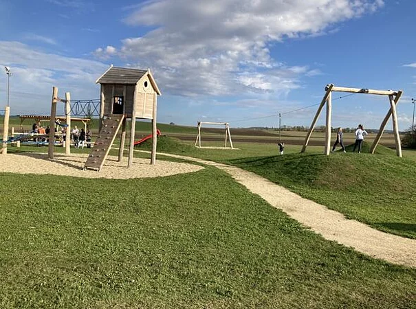In einem ersten Schritt wurde der Schwerpunkt auf die Umsetzung des Kinderspielplatzes gelegt. So findet sich im unmittelbaren Anschluss an den Treffpunkt ein barrierefrei bespielbarer Sandspielbereich mit einem Liegepodest für Kinder mit Mobilitätseinschränkung. Als zusätzliche Attraktion findet sich hier auch ein kleines Sandspielgerät. Eine Schaukelmöglichkeit für die ganz Kleinen sowie für die etwas größeren Kinder darf ebenso nicht fehlen: eine Schaukelkombination aus Babysitz und Brettschaukel. Ein Spielhügel mit einer breiten Rutsche lädt zum gemeinsamen Rutschen ein. Für eine breite Nutzergruppe geeignet ist auch der Balancierbereich mit Handlauf. Hier können auch ältere Menschen ihre Alltagsmobilität erproben. Als aktive Spielelemente laden das Stelzenhaus mit zusätzlichem Kletterbereich sowie eine Seilbahn die Kinder zum Bespielen ein. In weiterer Folge werden der Bereich für Jugendliche sowie Erwachsene ausgebaut.