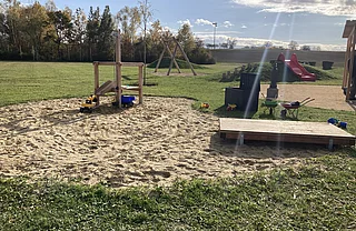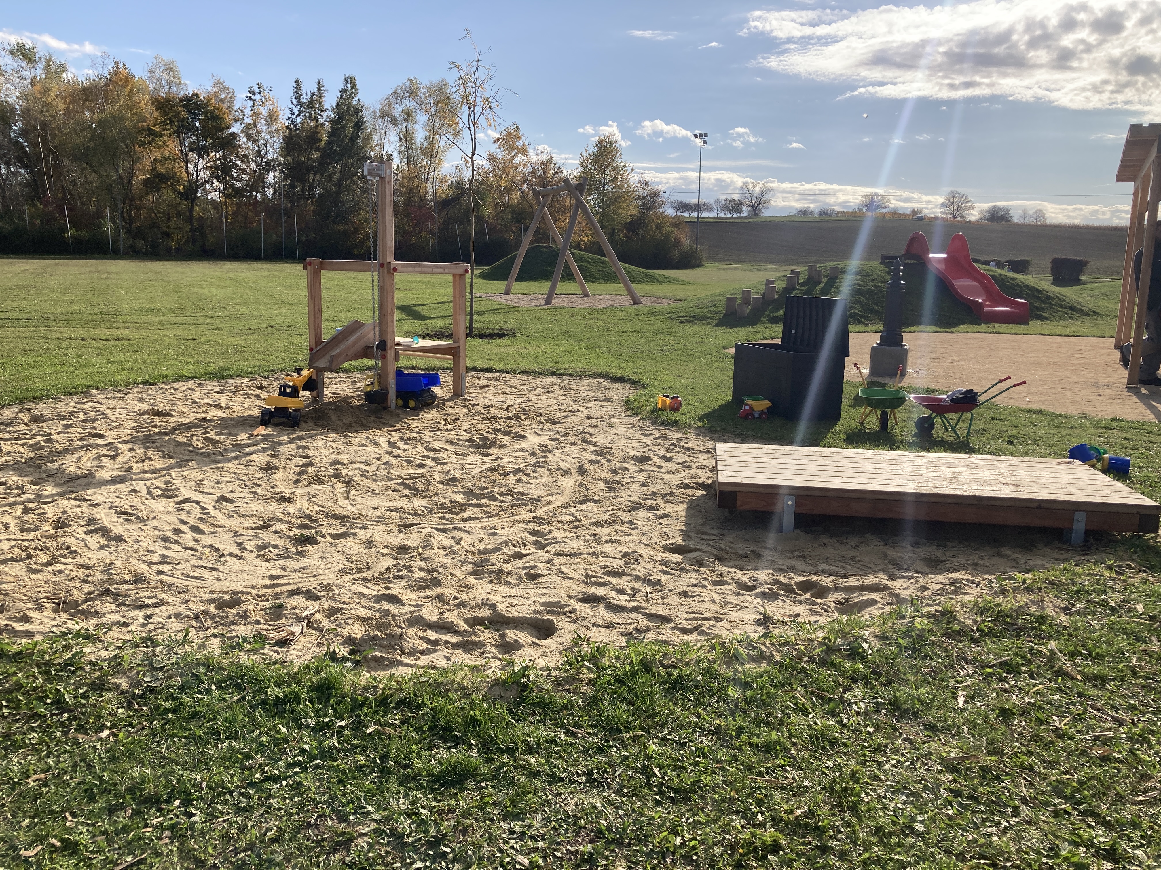 - Sandspielbereich mit Sandbaustelle und Liegebrett