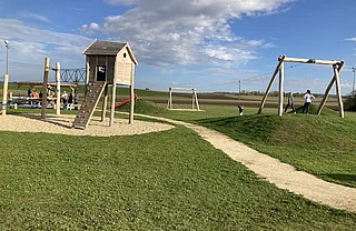 - Spielhügel mit Balancierstrecke und Breitrutsche